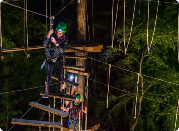 Pimedas seiklusrajal liikudes saad hoopis uue elamuse. Kõrgused ei ole nii tuntavad, küll aga tuleb appi pimedus ja kauguste tajuvus. Pealampide ja tulukeste valgel saad osa sootuks teistlaadi reaalsusest!